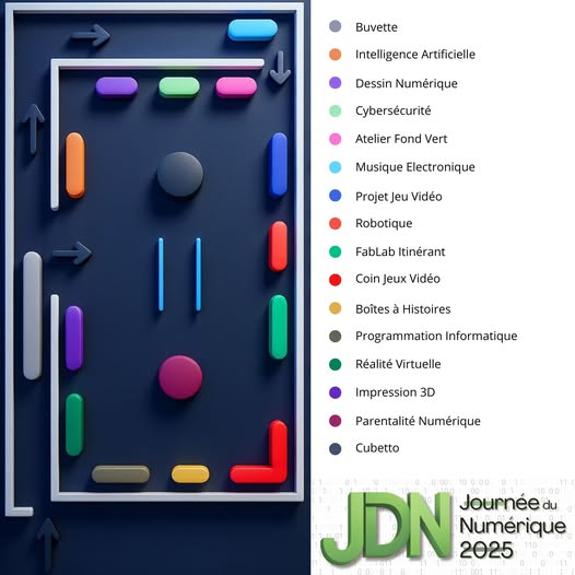 La "JDN" est un événement dédié au numérique avec une quinzaine d’activités ludiques pour découvrir les derniers usages liés aux nouvelles technologies : Impression 3D, Jeu-vidéo, Musique électronique, Intelligence Artificielle, Dessin numérique, Cybersécurité, Réalité Virtuelle, Programmation ... Et bien plus encore !