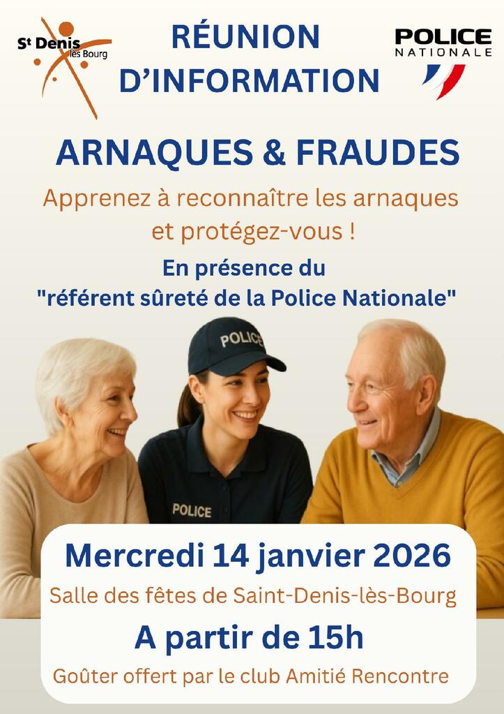 Parce que les tentatives de fraudes, arnaques en tout genre et abus sont de plus en plus fréquentes, et très bien maîtrisées de la part des auteurs, la Police Nationale et la commune s'associent et proposent conjointement une réunion d'information à ce sujet malheureusement d'actualité.